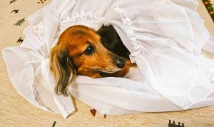 洗濯をしたレースのカーテンを取り込んだら、あんずが包まって